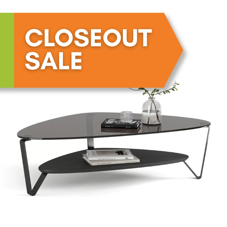 With its adaptable and unique triangular design, this glass-topped coffee table is an exceptional option for a variety of environments and seating arrangements. Available in 3 finishes: ash, walnut, or stone.