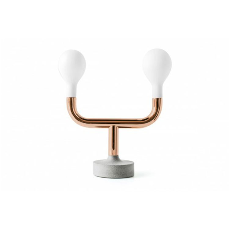 The Pom Pom Table Lamp features two glass lighting elements that are symmetrical on the frame and finished with a soft touch. It also comes in suspension and floor version.