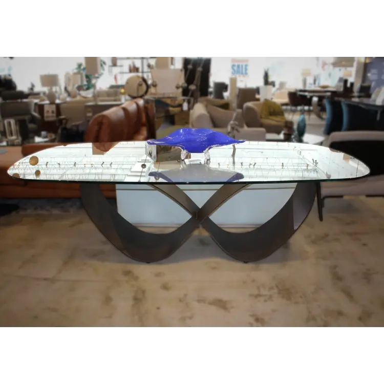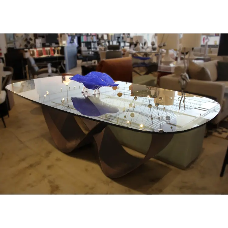 The Butterfly table is a striking exploration of form and movement, designed to command attention from every angle. Its sculpted metal foundation anchors the space with artistic confidence, transforming the dining room into a modern gallery. A delicately placed glass surface floats above the base, creating a compelling tension between lightness and strength.
