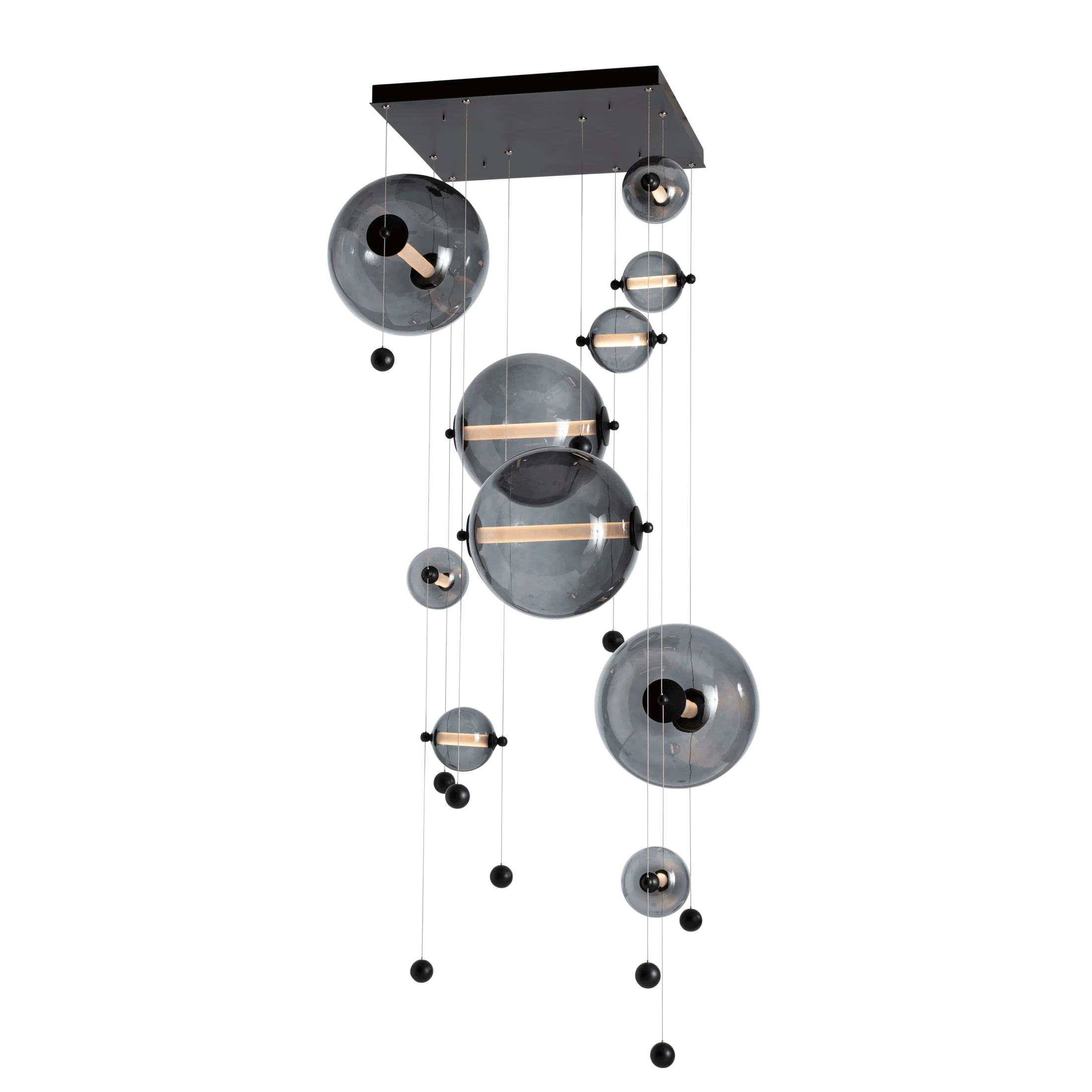Features: Adjustable height cable-hung statement LED pendant featuring ten glass globes with integrated LED arrays suspended from a square canopy. Each glass globe and LED array may be individually height adjusted from 60″ to 100″. Additional LED arrays may be purchased individually if desired. See Installation Instructions for more details. Please note, the upper canopy can will always be finished in black while the canopy faceplate will match the selected finish.