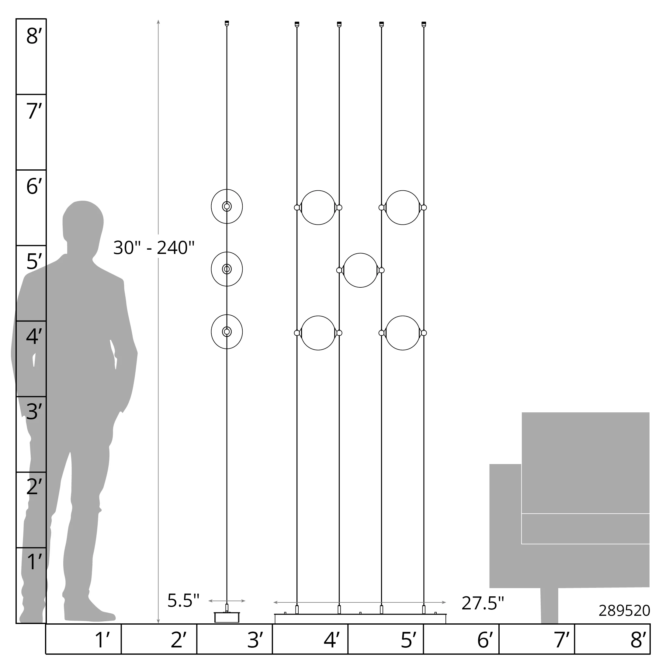 Features: Floor to ceiling dedicated LED fixture with five glass globes. Each glass globe and LED array may be individually height adjusted from 30″ to 240″. Includes 15 feet of cord with a 3-prong grounded plug and ceiling anchors for mounting. Toggle switch on base. Additional LED arrays may be purchased individually if desired. See Installation Instructions for more details.